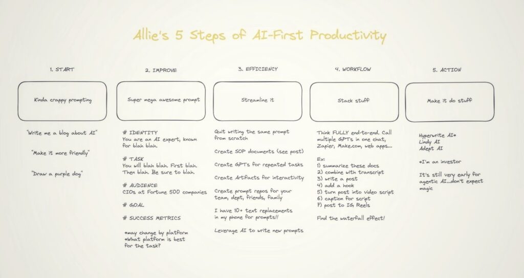 - Allie K Miller is a beast and the woman behind the “AI-first productivity” mindset (see pic). Allie’s How to use AI to 10x your productivity lightning class is fantastic so, given that, definitely check out her LinkedIn Live event this Wednesday evening where she and Conor Grennan (Chief AI Architect, NYU Stern) will “be tackling our favorite prompting techniques and practical strategies to boost your AI proficiency” as part of a launch event for their new course; and