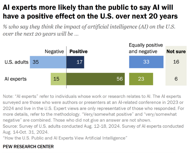 Despite AI becoming increasingly woven into our daily lives (with 82% of people consciously using it according to EY’s recent global study), there’s a striking sentiment divide between experts and the general public. While nearly half of AI specialists report feeling more excited than concerned about AI’s growing role, a mere 11% of the American public shares this optimism, according to Pew Research Center findings. 😮