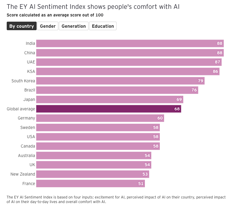 This trust deficit presents a critical challenge for the AI industry moving forward. With 63% of Americans believing they’ll never trust AI with important personal decisions (while experts are split on this question), companies and governments face an uphill battle to build public confidence. Both experts and the public worry more about insufficient regulation than overregulation, yet neither group has much faith in government or corporate leadership to handle AI responsibly (Pew found 62% of the public and 53% of experts lack confidence in the US government to regulate AI effectively). Worth noting there are also interesting national differentials coming out as well: