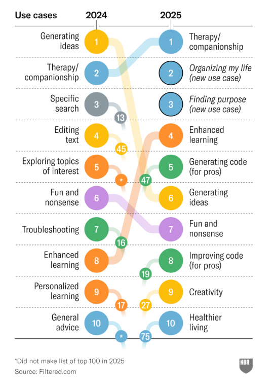 Welcome to the unexpected reality of AI in 2025! According to Harvard Business Review’s latest research, the #1 use case for generative AI is now therapy and companionship, with “organising my life” and “finding purpose” rounding out the top three. This marks a dramatic shift from technical applications to emotional support and personal development, reflecting a fundamental evolution in how we’re integrating these technologies into our lives. As one South African user explained, “Where I’m from, mental healthcare barely exists… large language models are accessible to everyone, and they can help.” 🌟