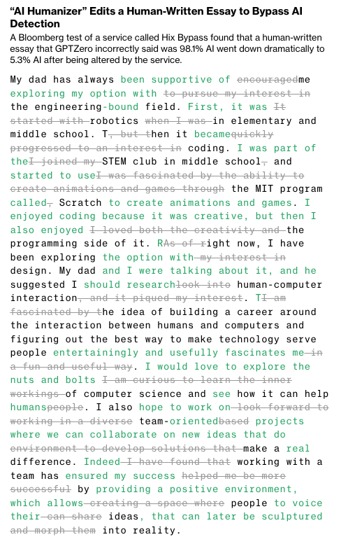 And given these are people on the other end of those submissions, approaching this in a punitive fashion is deeply unhelpful and even perhaps immoral when students can be accused with this and have no way to prove their innocence. And then there are things like the emerging class of AI Humanisers like Hix Bypass that can “Generate human-like, undetectable writing… Plagiarism-free guaranteed!”