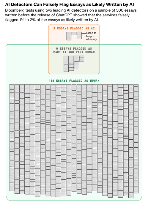 Great breakdown on this from Bloomberg (AI Detectors Falsely Accuse Students of Cheating – With Big Consequences) showing leading AI detectors confidently labelling essays written before the release of ChatGPT as “likely written by AI”. 1-2% error rates don’t seem like a lot but when you’re talking about hundreds, thousands of essays – that adds up quickly: