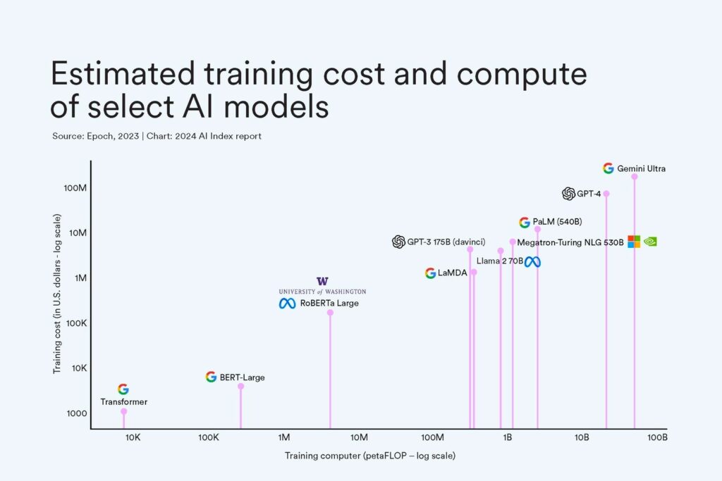 Google and OpenAI are at the forefront of this, releasing incredibly powerful foundation models that are achieving human-level performance on a variety of benchmarks. In terms of who’s doing what, industry accounted for nearly 75% of all new models in 2023 (as opposed to academia, government, etc.). However, this remarkable progress comes at a steep cost, with training expenses soaring into the hundreds of millions. Google’s Gemini Ultra alone cost an estimated $191 million to train (see pic 💸).