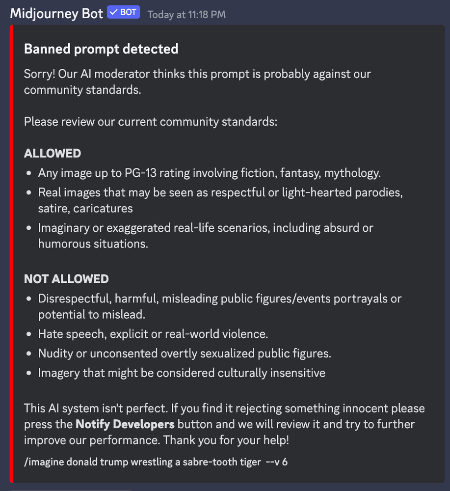 Because the potential is broad – celebrities, public figures … even members of family being impersonated, with personalised mass phishing calls, fake news and more… There are slight signs of hope though – guardrails are being built into tools (see the pic below when I asked for a picture of Donald Trump – though easily circumvented – see the banner image at top), there are suggestions that unreal light sources and other elements might be a tell that can be used to detect AI-generated images (for now, at least). And, in welcome news, it seems like the US might be joining the UK in banning the creation and sharing of deepfakes. Looks like we’re in for a bumpy ride here…
