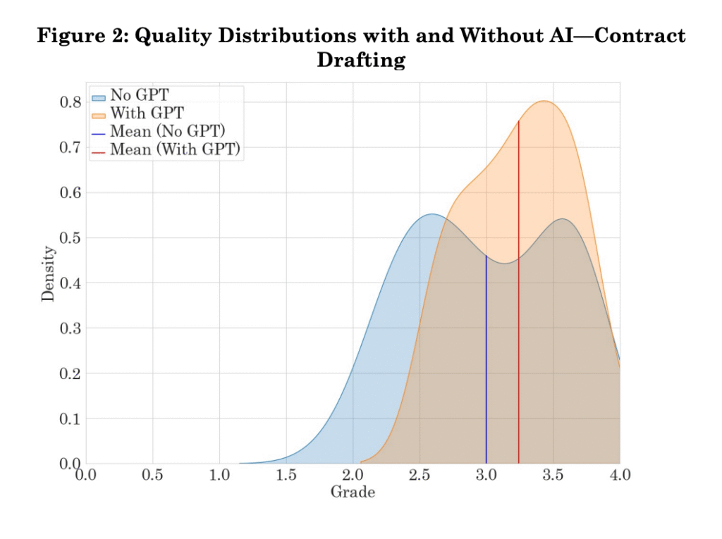 Choi et al found a levelling effect where the output of weaker-performing students using a GPT4-based AI was improved to near that of the higher-performing students (see below). Otherwise all participants, regardless of level, enjoyed significantly increased speed and satisfaction from using AI to complete legal tasks. Looking forward to seeing more studies along these lines as the rollout of built-in platforms like MS365 Copilot and Google Bard improve and the year progresses… 👀 🍿